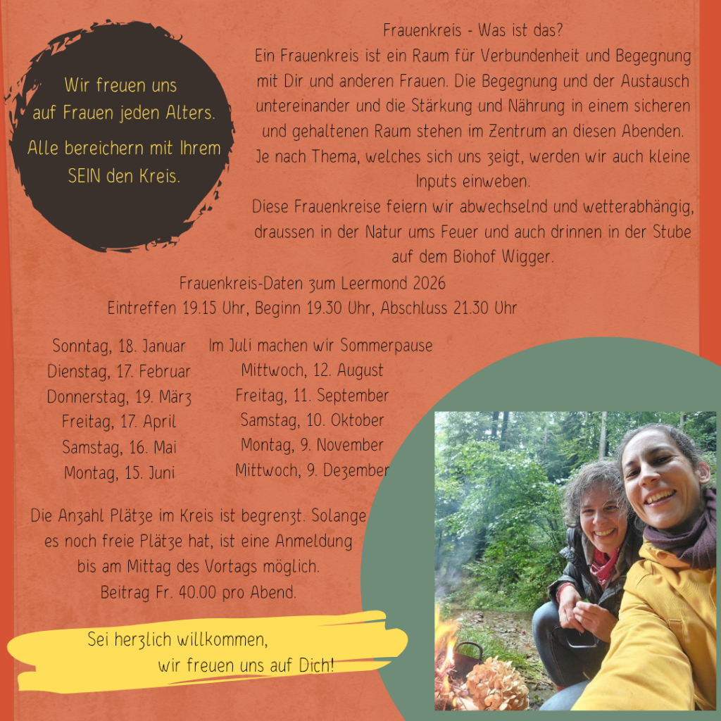 Frauenkreise jeweils zum Leermond🌑: Eintreffen 19.15 Uhr auf dem Biohof Wigger, Beginn 19.30 Uhr, Abschluss 21.30 Uhr